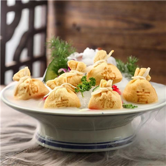 產(chǎn)品特性:優(yōu)質(zhì)豆皮包裹金黃飽滿魚籽,意頭十足,形狀如袋子故稱福袋,口感滑嫩彈牙,鮮香濃郁!