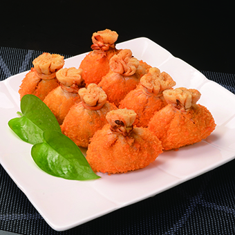 做法:魚(yú)籽福袋解凍后裹上面包糠,放入熱油中炸至金黃即可。